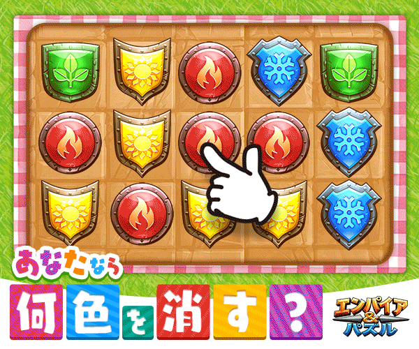 『エンパイア&パズル』は、パズルゲームと城塞建設要素を組み合わせた新感覚RPGゲーム! 同じ色のパネルを3つ以上揃えて消していくと、敵に攻撃を仕掛けたり、英雄のスキルを使うことが可能!